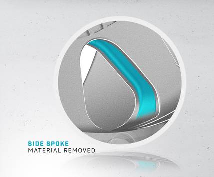 Wheel spoke sides are machined to remove nonstructural material which creates an I-Beam cross section shape which strengthens the entire spoke structure while decreasing weight on select wheels.